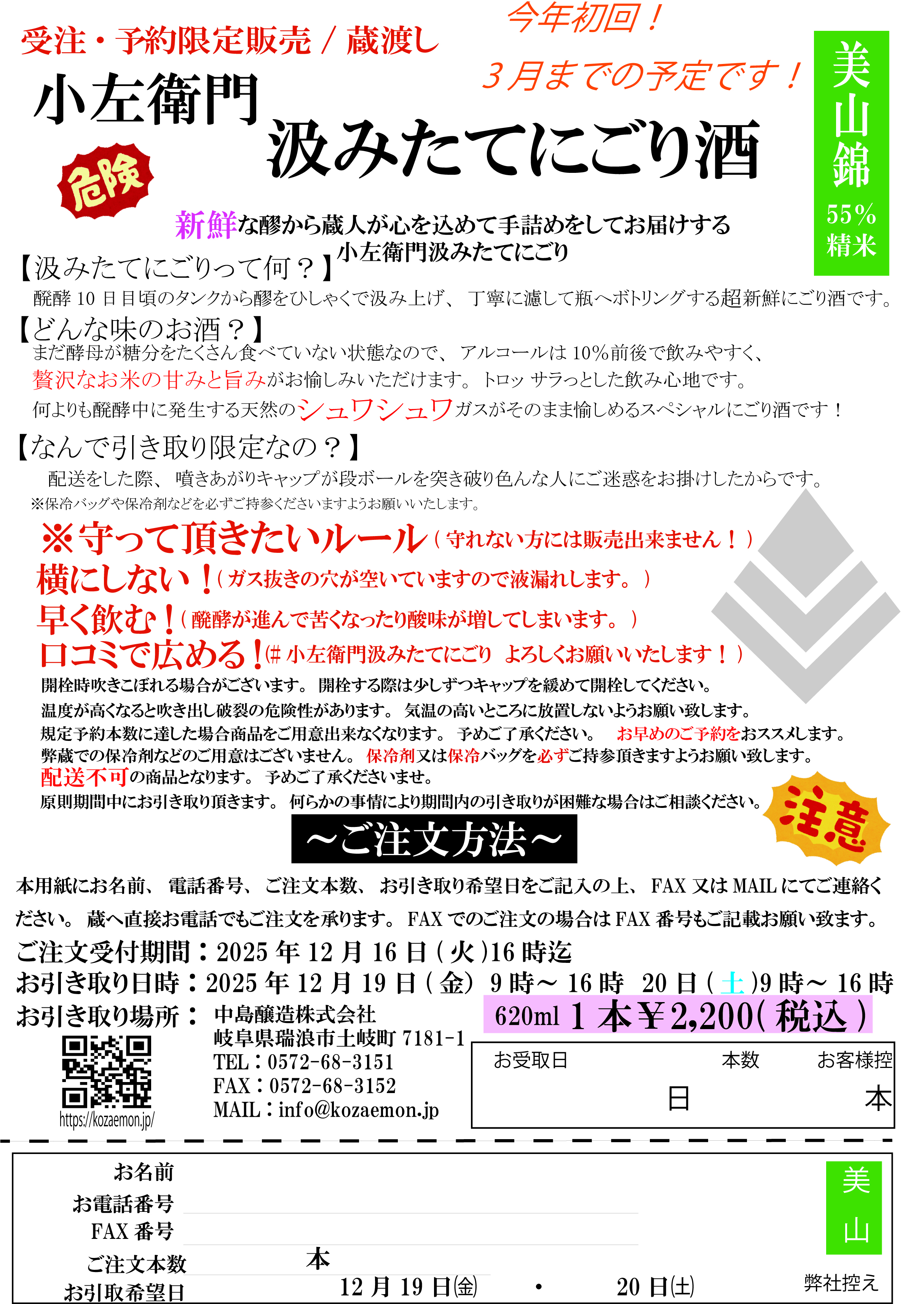 2025年冬 今シーズン第一弾! 小左衛門 汲みたてにごり 美山錦